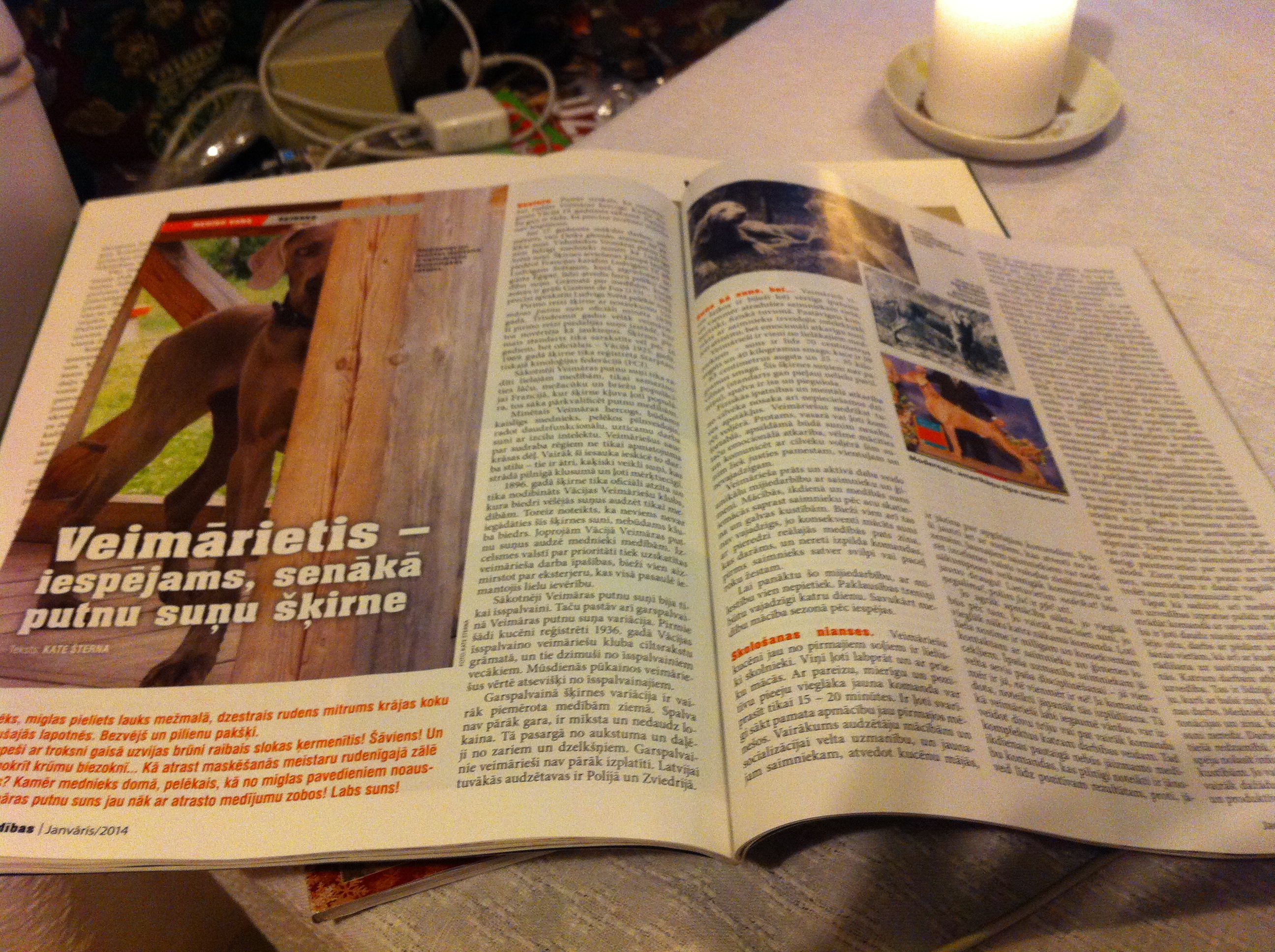 Žurnāla Medības 2014.gada janvāra numurā divi raksti. Pirmais par Veimāras putnu suņiem, ko iespējams uzskata par senāko putnu suņu šķirni, kā arī raksts par suņu apkopi, kad tie sasnieguši pensijas vecumu.