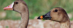 Attēlā: Priekšplānā sējas zoss, fonā – baltpieres zoss.